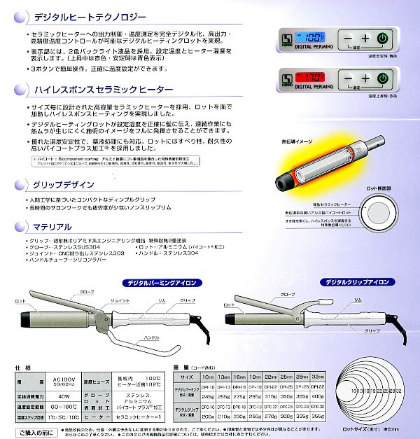 ハッコー デジタルパーミングアイロン ◆特徴 セラミックヒーターへの出力制御、温度設定を完全デジタル化した最新鋭のパーミングアイロン。
