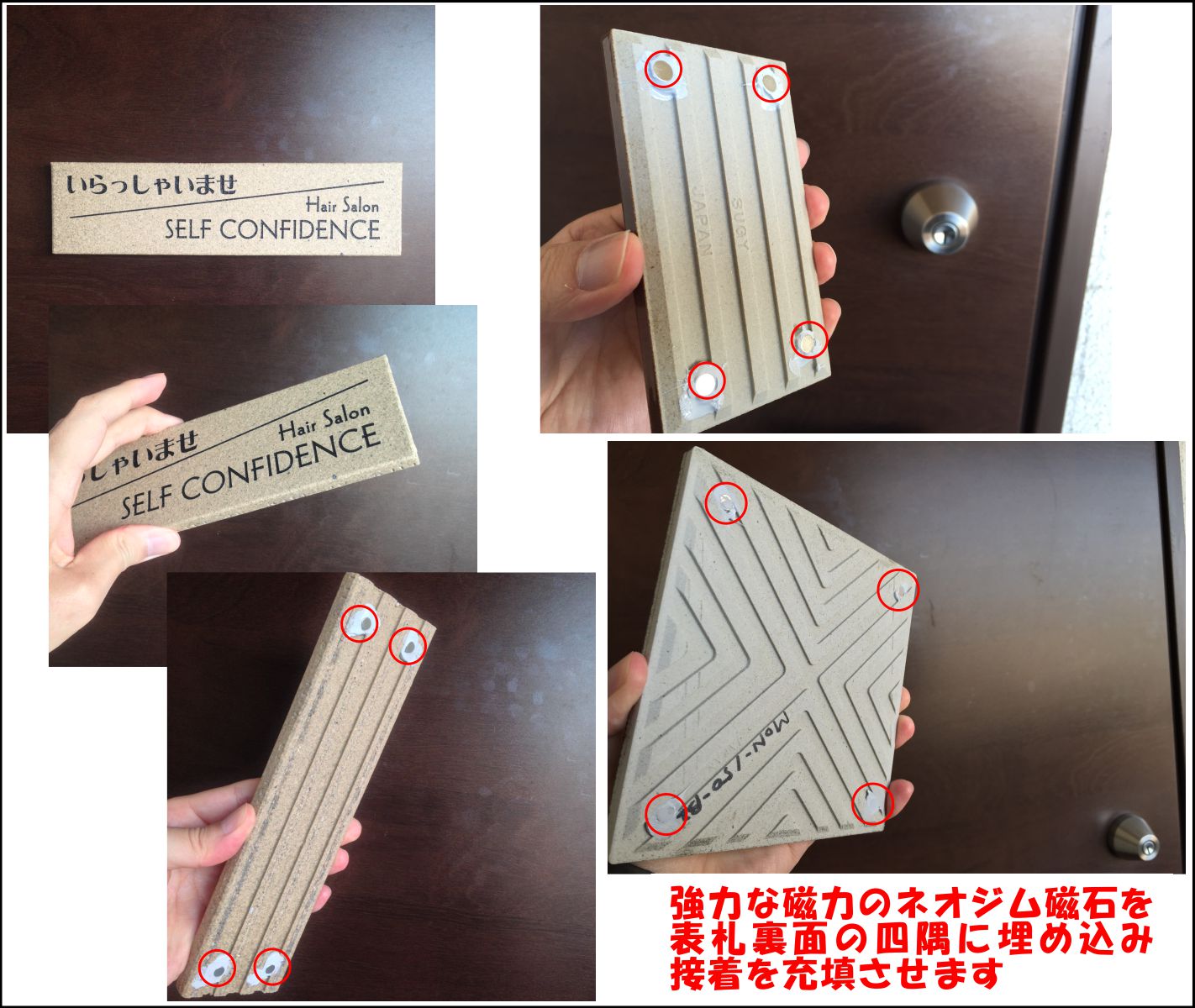 強力な磁力のネオジム磁石をタイル表札の裏面四隅に埋め込み接着します。